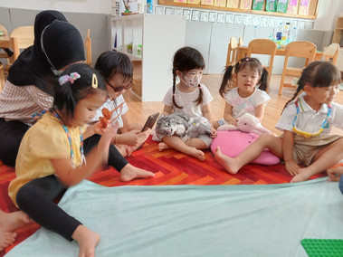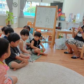 Every morning, the first 30 minutes of each class is devoted to "Circle Time.' It's a chance for the students and teacher to 'warm up' together and start the day. Teachers sometimes review lessons and vocabulary from the previous lessons, other times it is a physical warm up with stretching, songs and dance. It's an opportunity for the class to gather and start the day together.