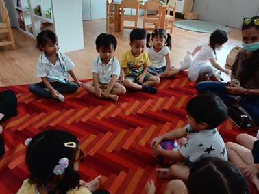 Prior to circle time, kids have some free time to move about and communicate with each other independently and unstructured. This is their office 'water cooler' time. Where they informally share play and interaction. After a bit of that style of 'warm up' they gather for Circle Time -this is the structured start of the day for the class to come together with each other and focus on the day ahead.